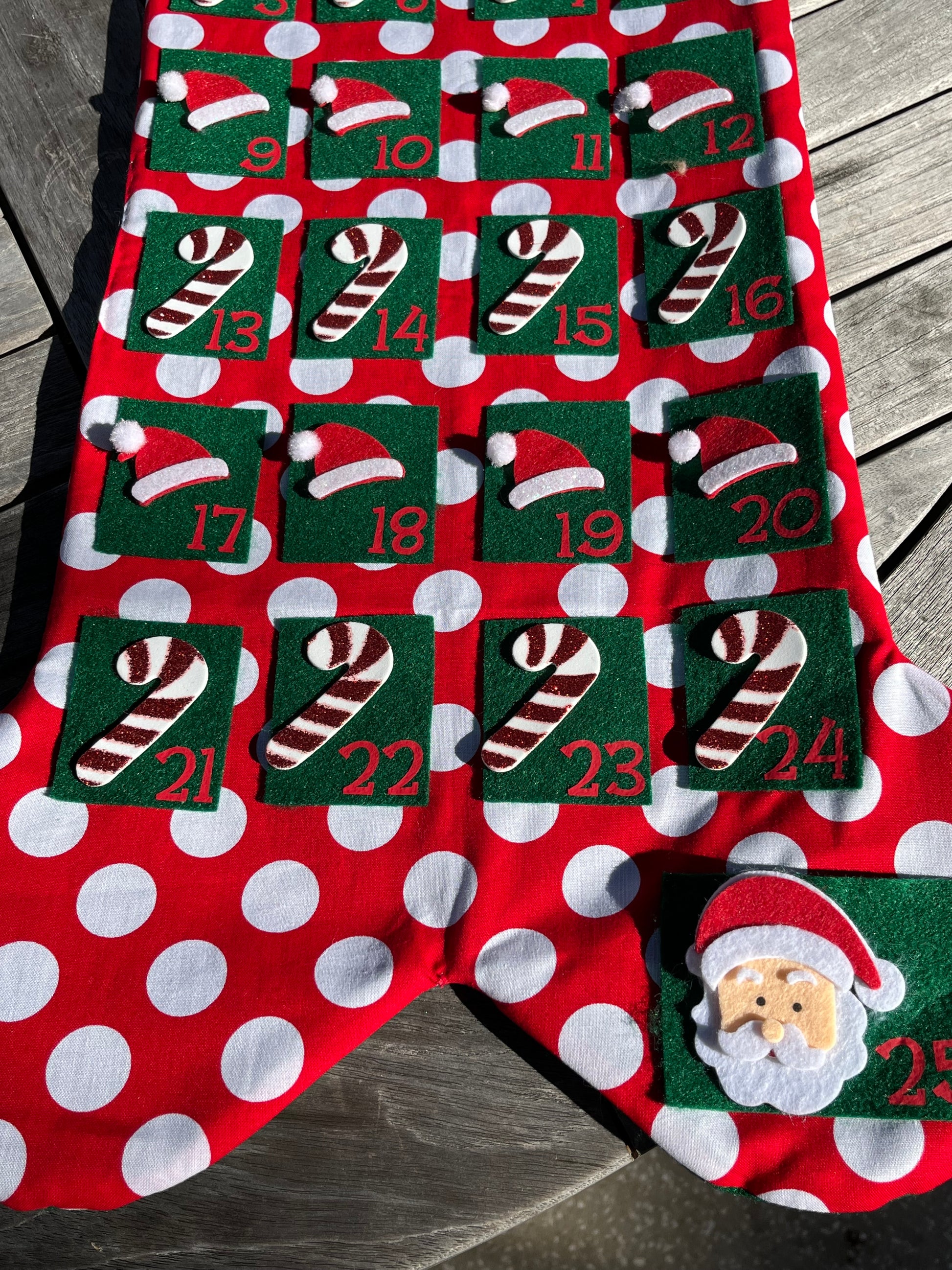 Handmade each calendar measures approx 2ft x 1.5ft. Fun festive cotton fabric with 24 felt pockets to count down the days until Santa. All you do is find the perfect place to hang your calendar (safe from pets) and fill the pockets. Treats not included.