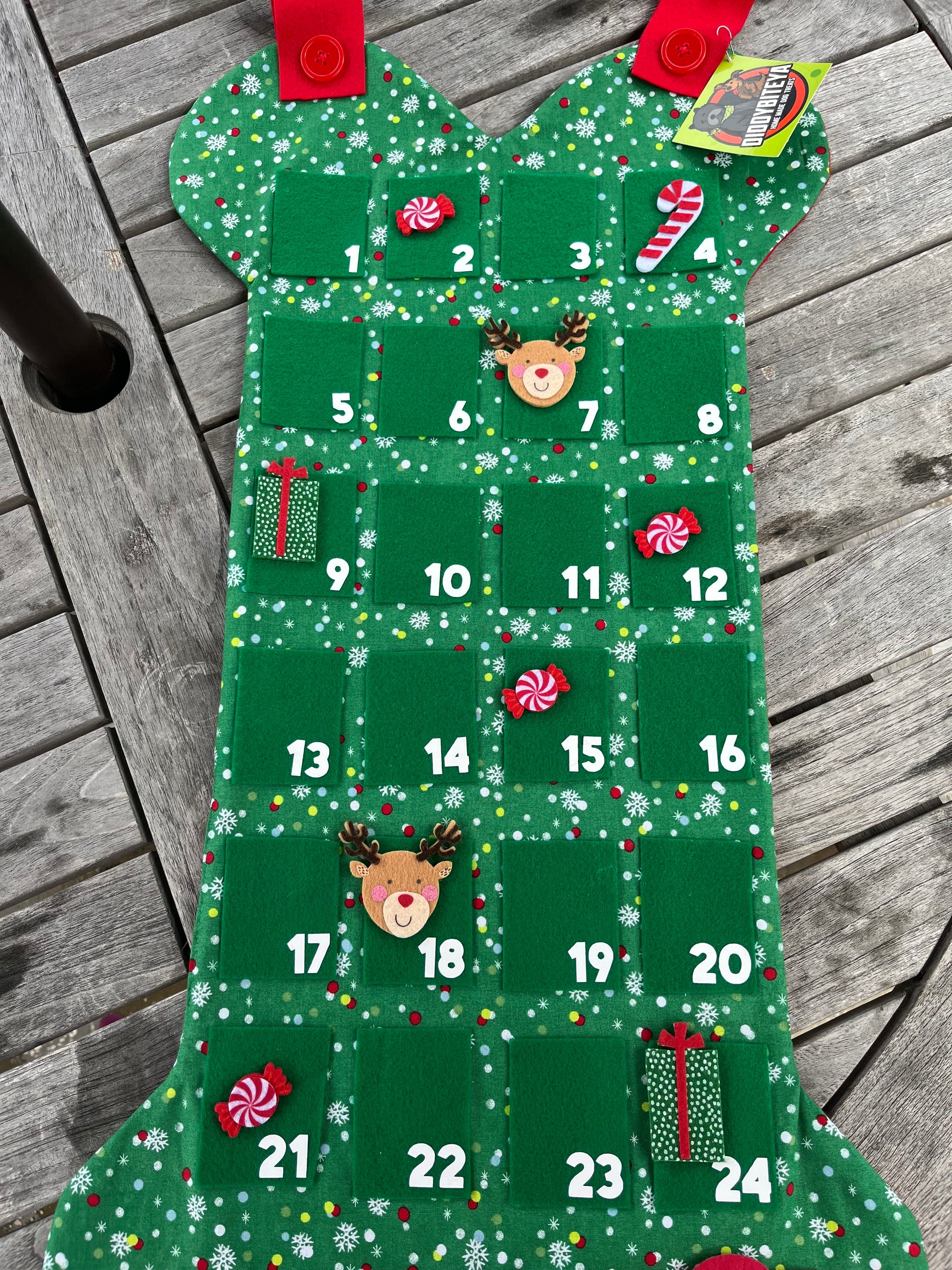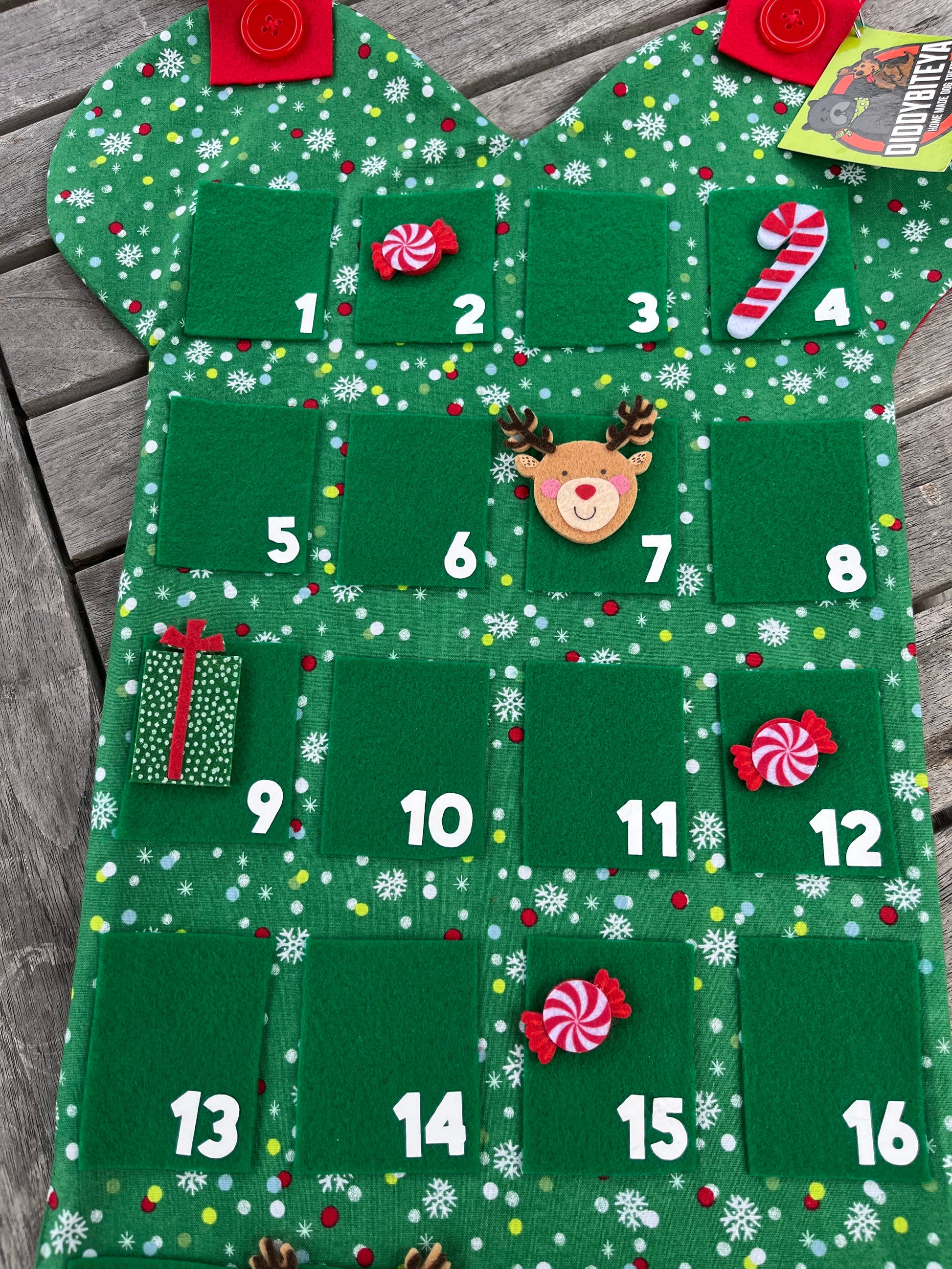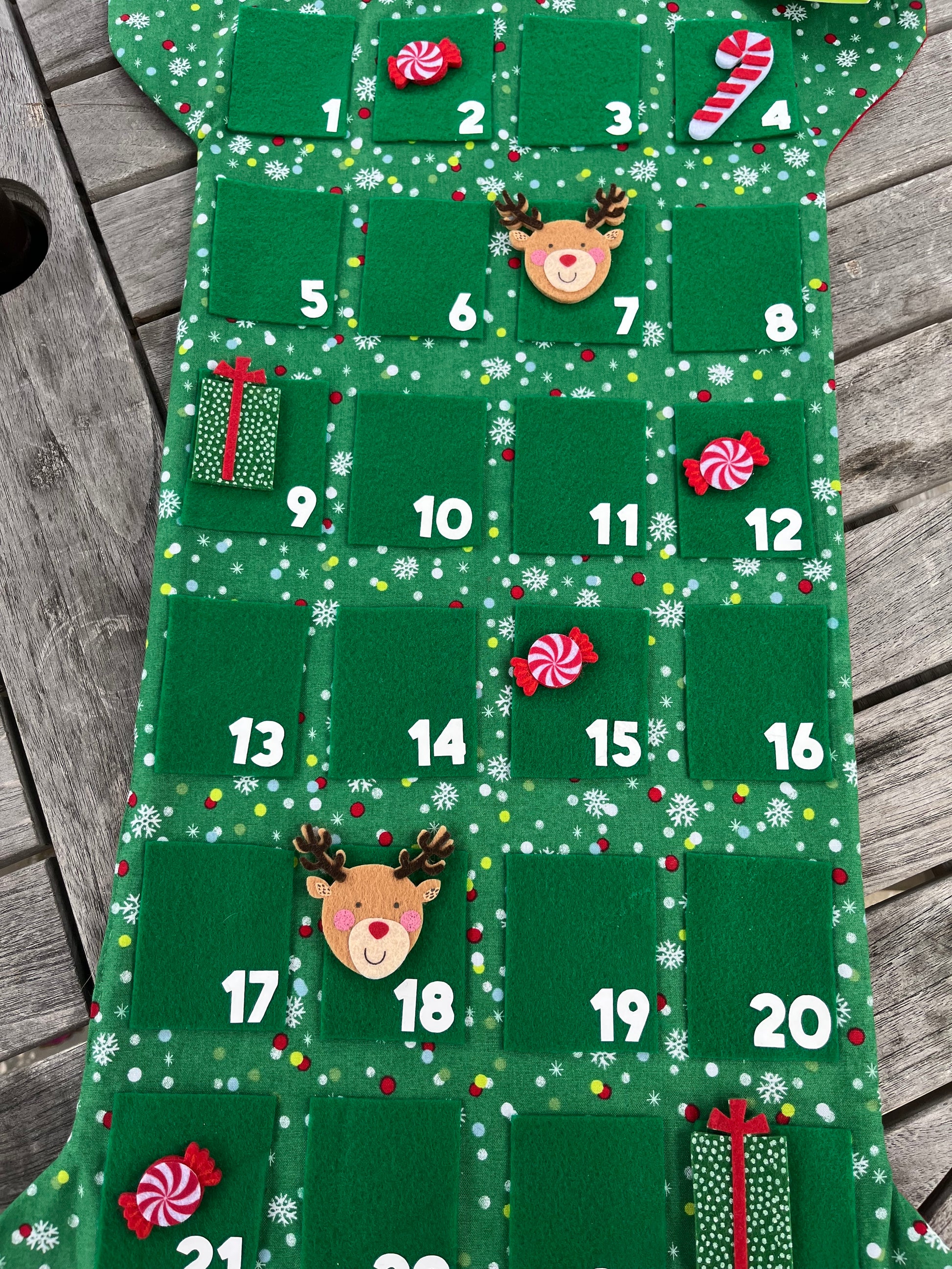 Handmade each calendar measures approx 2ft x 1.5ft. Fun festive cotton fabric with 24 felt pockets to count down the days until Santa. All you do is find the perfect place to hang your calendar (safe from pets) and fill the pockets. Treats not included.