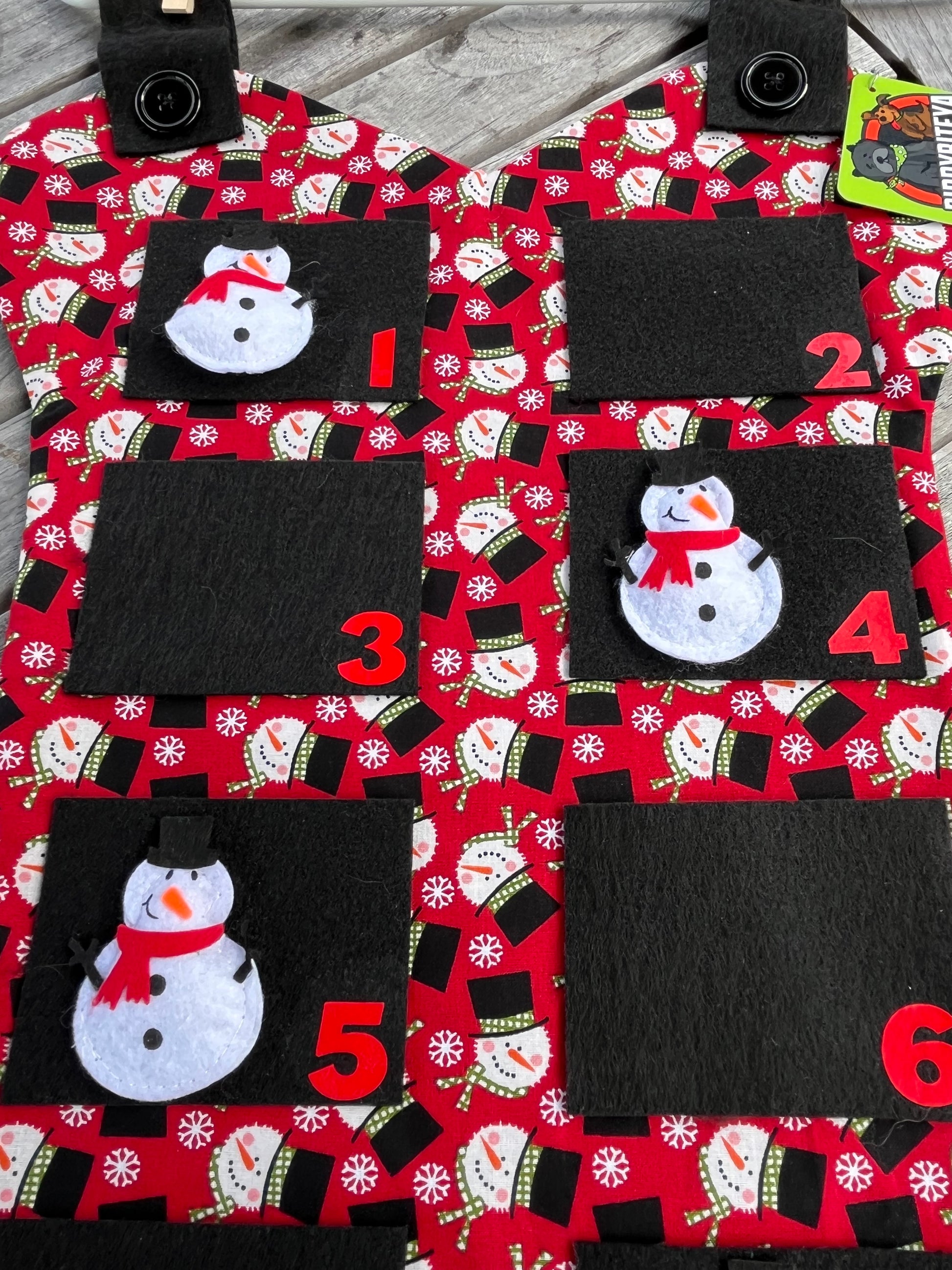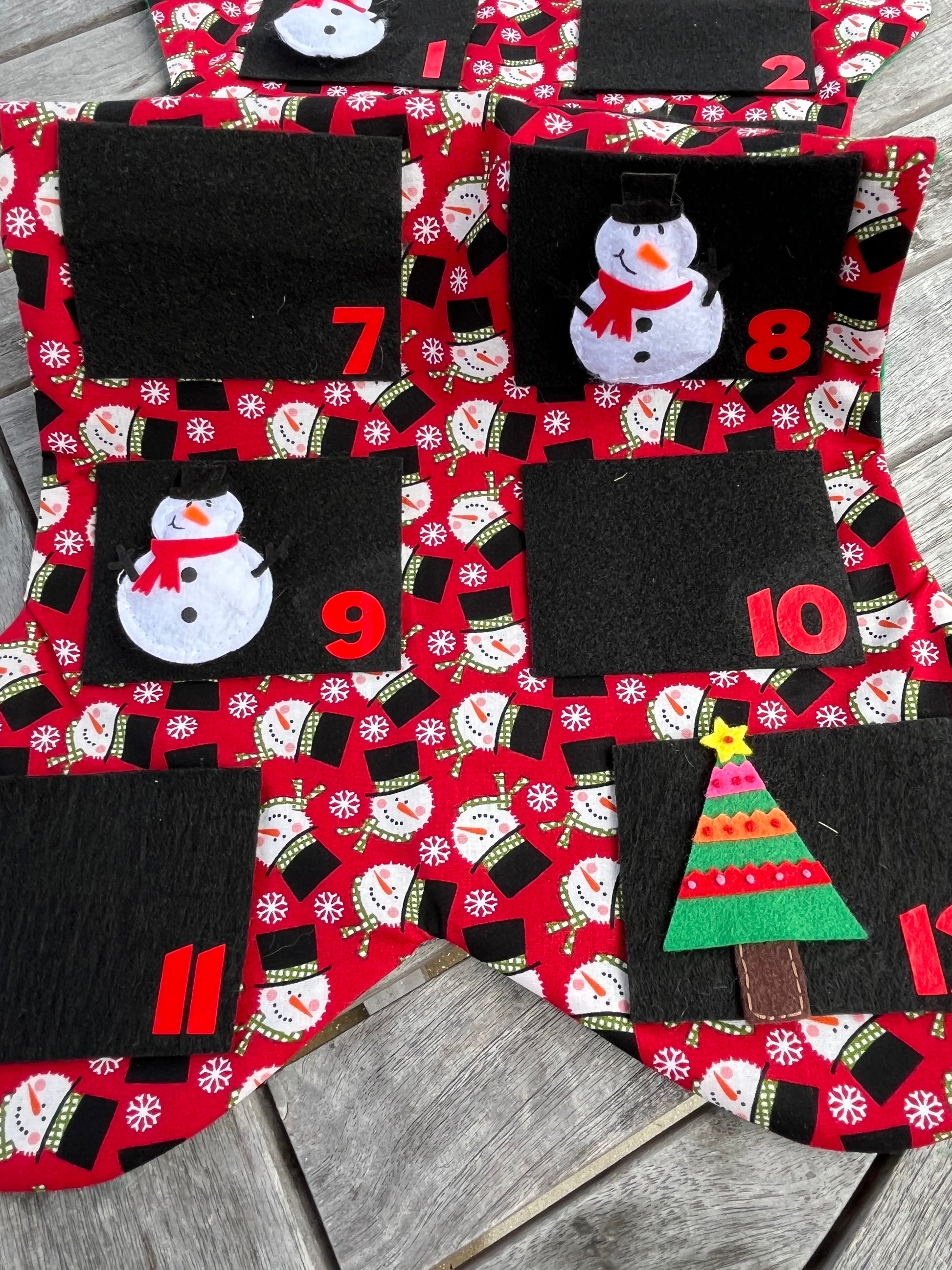 Handmade each calendar measures approx 2ft x 1.5ft. Fun festive cotton fabric with 12 felt pockets & felt snowman/Christmas tree decorations. Treats not included.