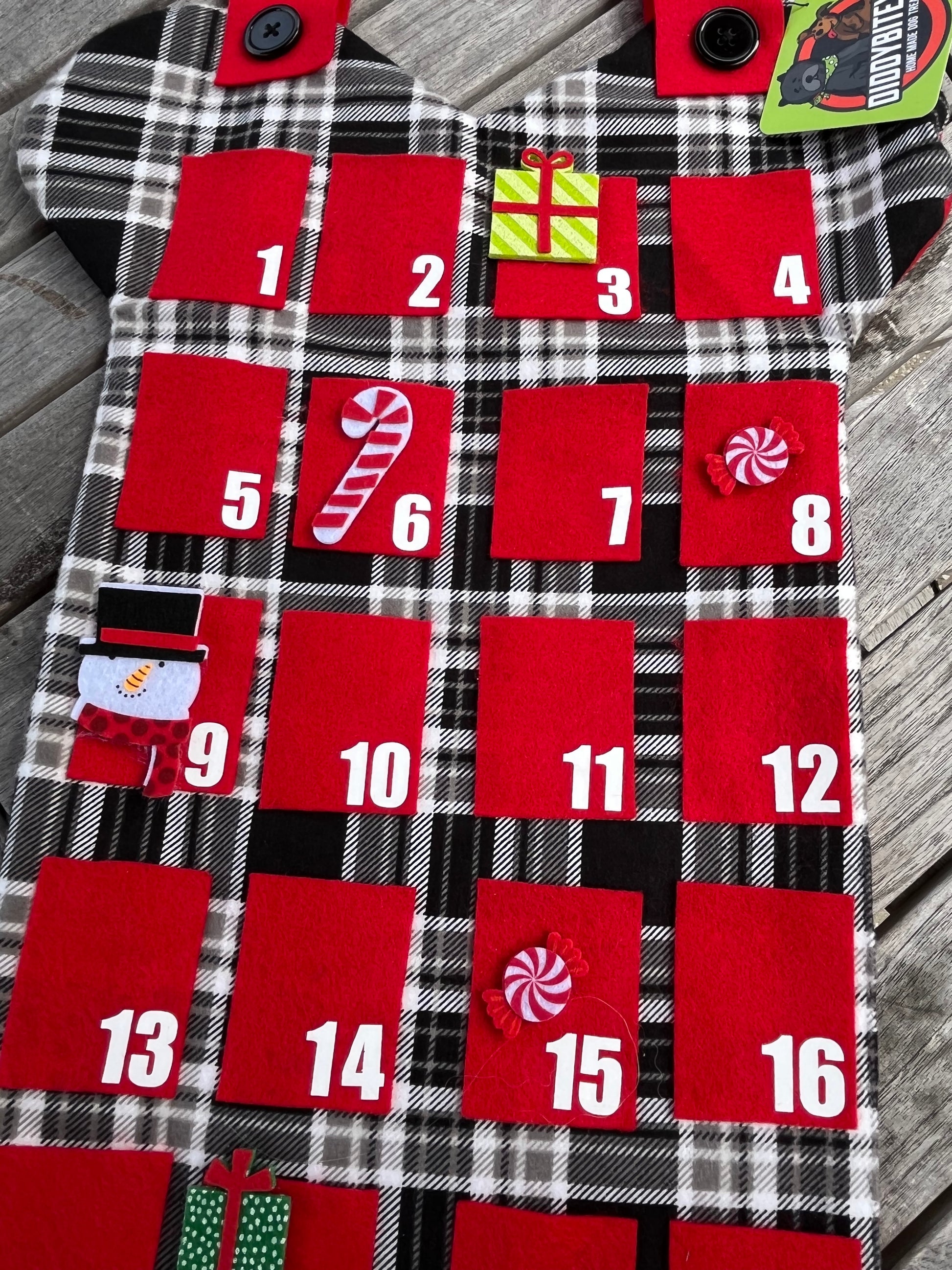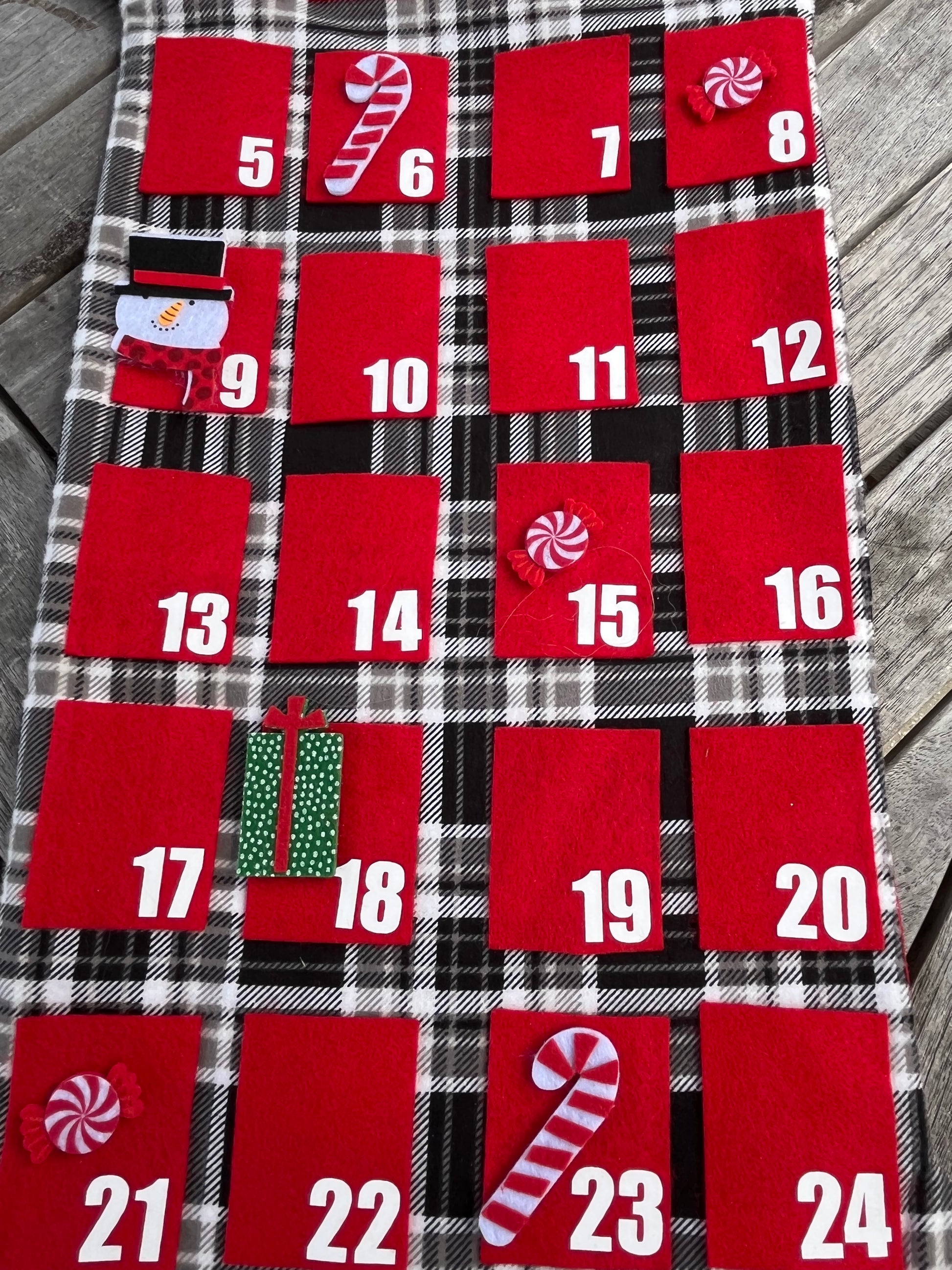 Handmade each calendar measures approx 2ft x 1.5ft. Fun festive cotton fabric with 24 felt pockets to count down the days until Santa. All you do is find the perfect place to hang your calendar (safe from pets) and fill the pockets. Treats not included.