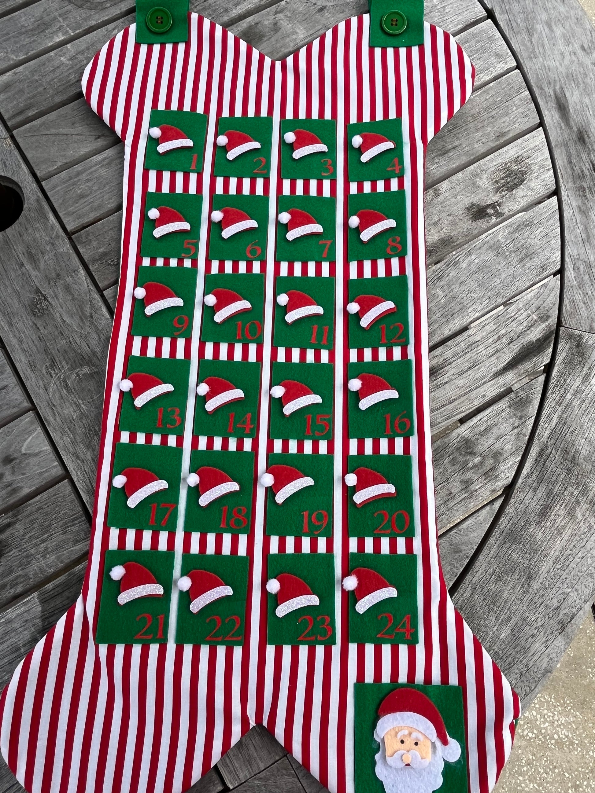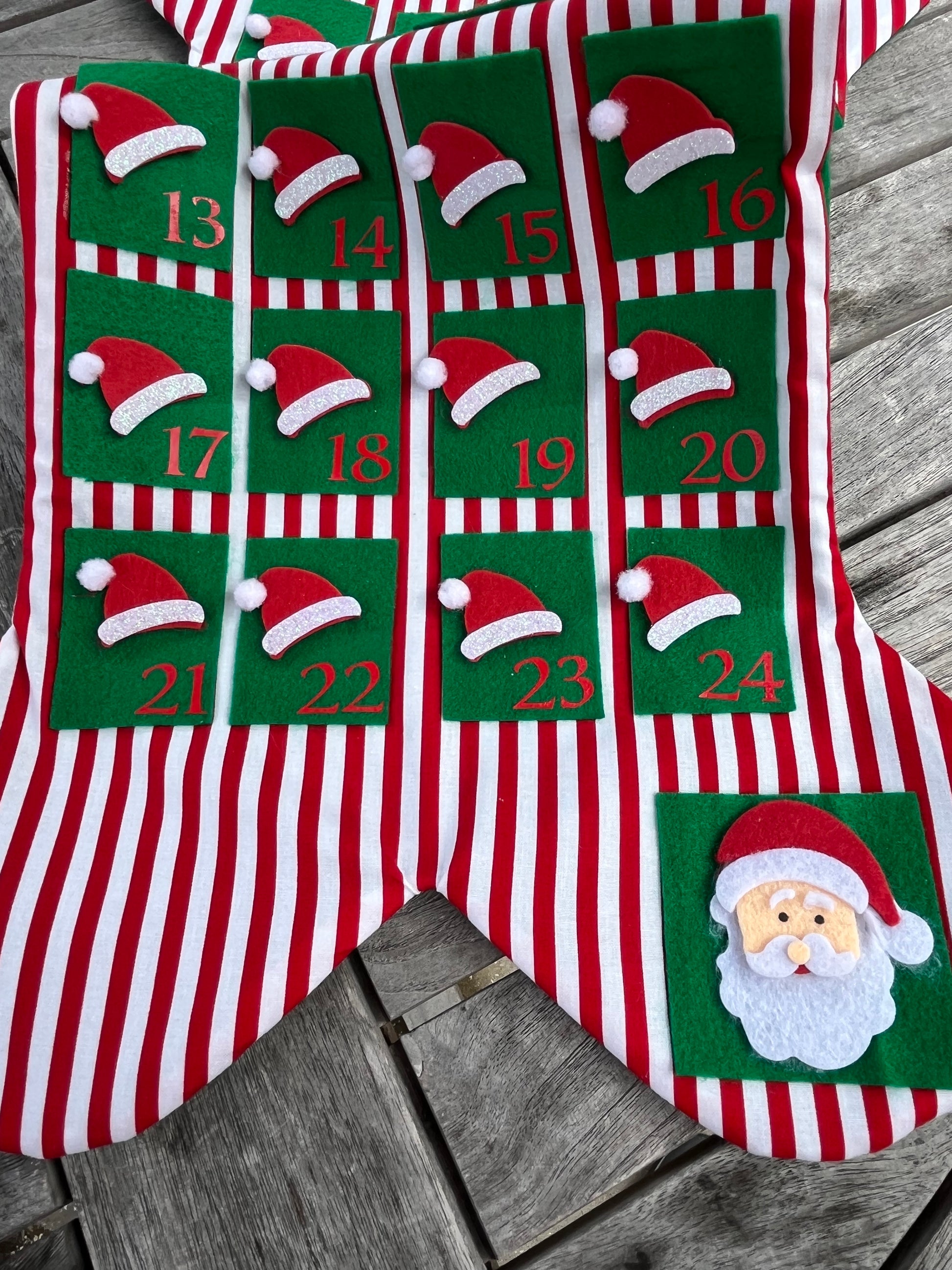 Handmade each calendar measures approx 2ft x 1.5ft. Fun festive cotton fabric with 24 felt pockets to count down the days until Santa. All you do is find the perfect place to hang your calendar (safe from pets) and fill the pockets. Treats not included.