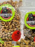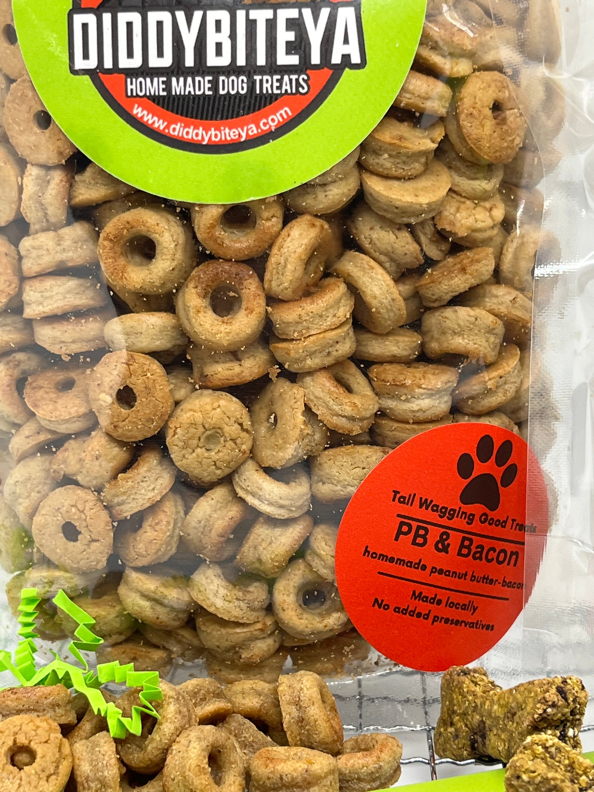 PB Piggy Bag 12oz treats (peanut butter/bacon) -our "always in demand" mini donut shaped treats! Ingredients: Oats, Peanuts, Bacon, Honey, Egg, Coconut Oil. Guaranteed Analysis: Crude Protein (min) 22% Crude Fat (min) 18% Crude Fiber (max) 17%