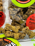 6oz Boo Berry Pumpkin (blueberries/pumpkin) - mini bones (approx 1/2 inch) made with our fresh blueberries and pumpkin. Ingredients: Oats, Blueberries, Pumpkin, Honey. Guaranteed Analysis: Crude Protein (min) 16% Crude Fat (min) 7% Crude Fiber (max) 5%