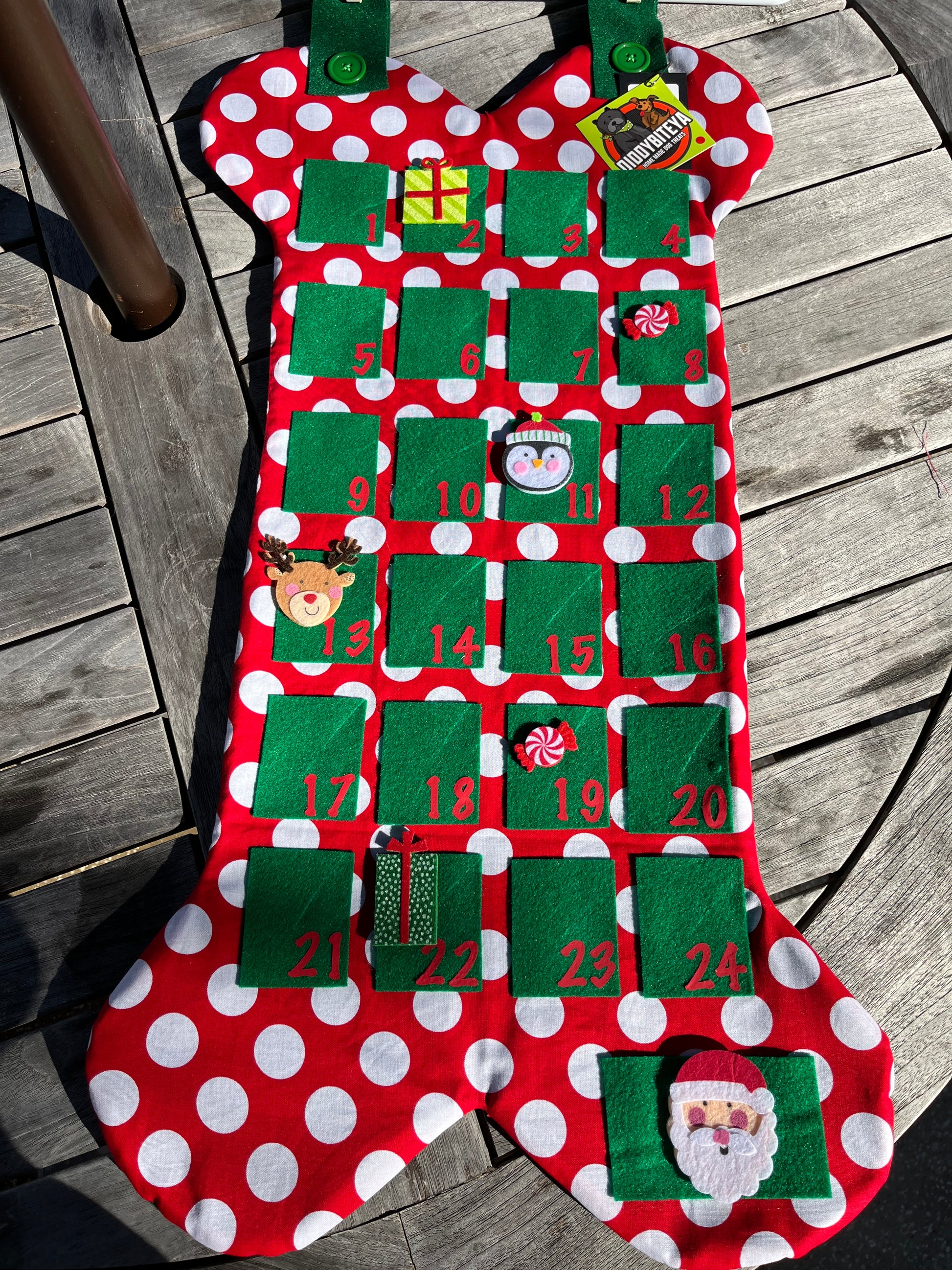 Handmade each calendar measures approx 2ft x 1.5ft. Fun festive cotton fabric with 25 felt pockets and felt decorations. Treats not included.