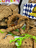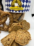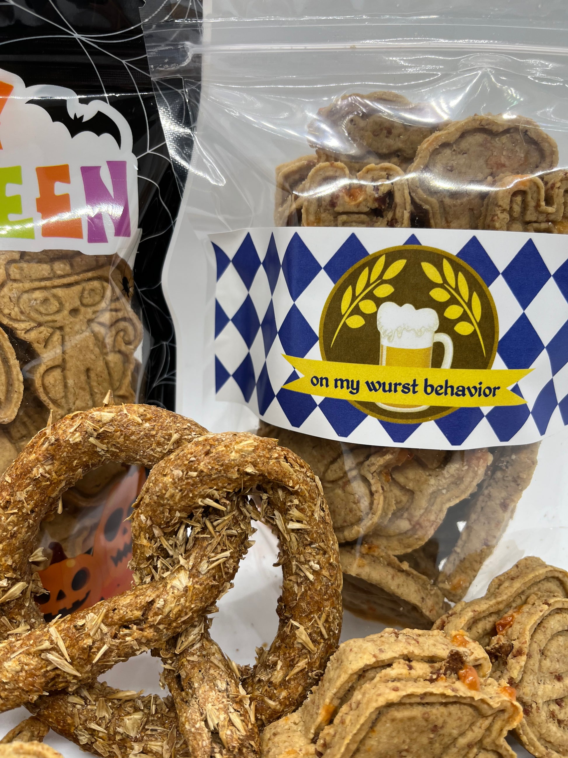 "On Our Wurst Behavior" Bag 6oz Bark Wurst treats (sausage, cheddar, Chicken) Festive Oktoberfest shapes of pretzels, beer mugs, Alpine hats and Lederhosen (approx 1.5 inch). Ingredients: Oats, Cheddar, Sausage, Chicken Stock, Egg. Guaranteed Analysis: Crude Protein (min) 22% Crude Fat (min) 17% Crude Fiber (max) 10%