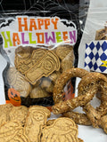 Halloween Bag 9oz Paw-Mutt Paws treats (peanut butter) - spooky Halloween shapes (approx 1.5 inch) made with our homemade peanut butter. Ingredients: Oats, Peanuts, Coconut Oil, Honey, Egg. Guaranteed Analysis: Crude Protein (min) 21% Crude Fat (min) 17% Crude Fiber (max) 13%