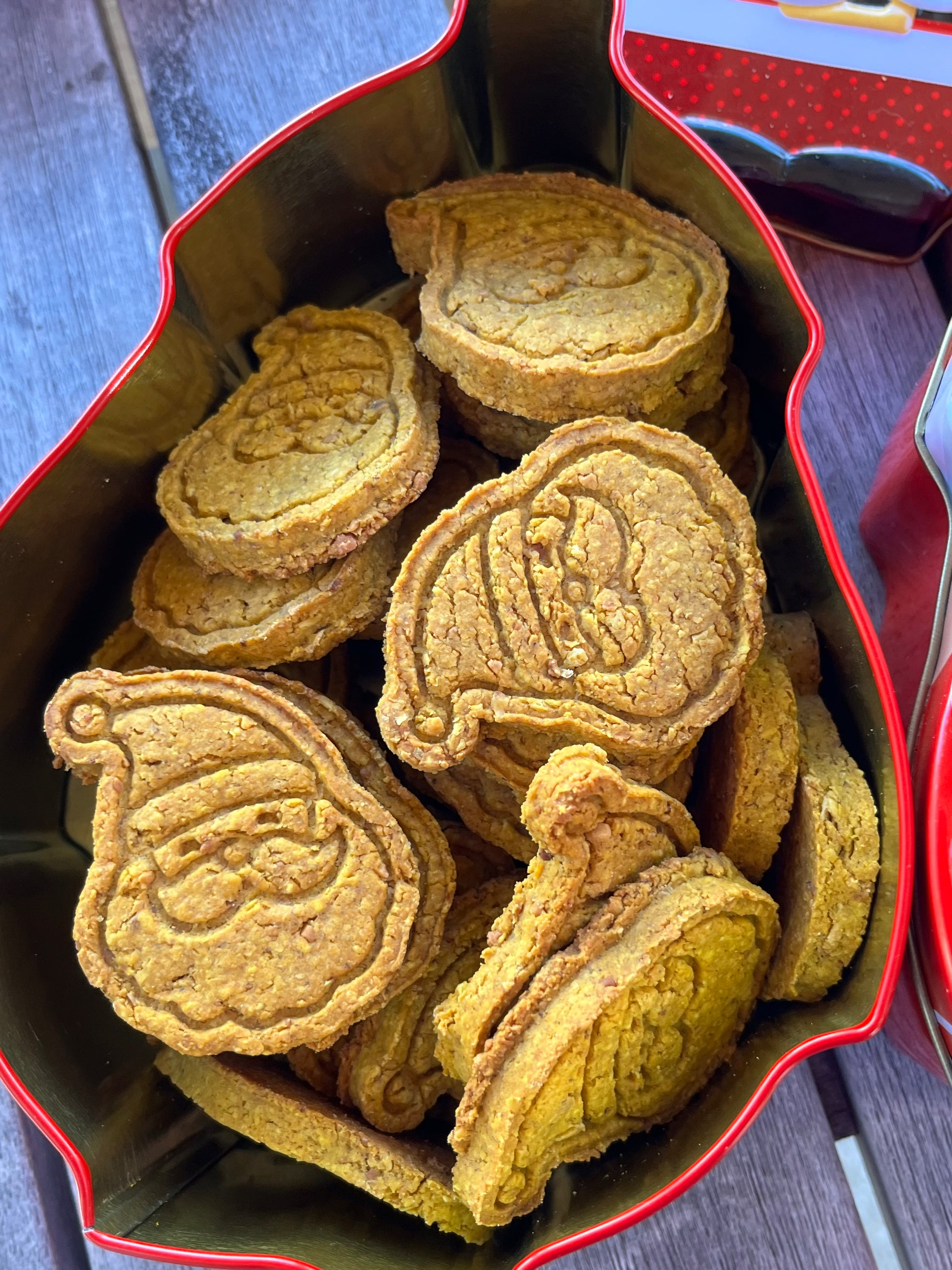 Ho ho ho—your pup's favorite holiday just got tastier! This festive Santa tin is packed with homemade peanut butter pumpkin treats shaped like jolly Santa. Perfect for spreading seasonal cheer to your furry friend, these wholesome bites combine two dog-approved flavors in one delightful package. Whether you're celebrating the holidays or just want to make tail-wagging memories, this paw-some tin brings festive fun to treat time. A gift that'll have your dog barking with joy!