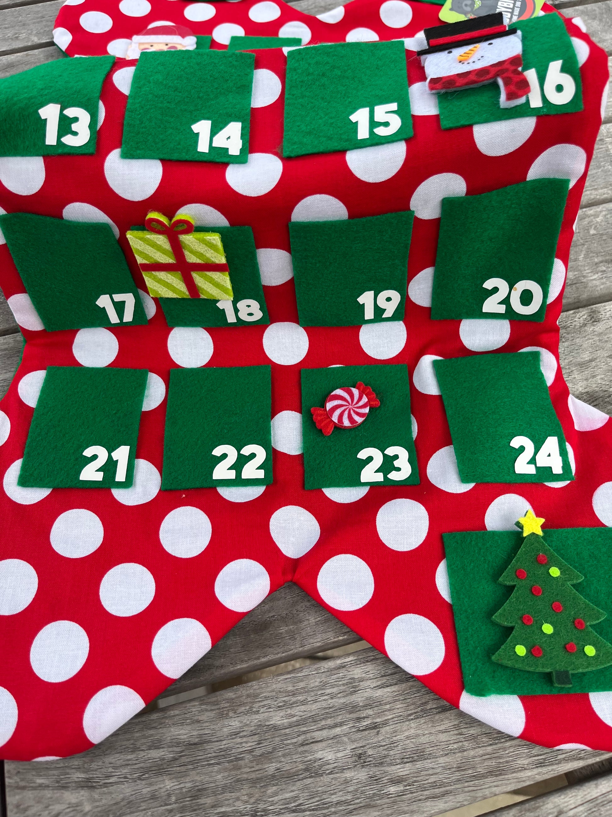 Handmade each calendar measures approx 2ft x 1.5ft. Fun festive cotton fabric with 24 felt pockets to count down the days until Santa. All you do is find the perfect place to hang your calendar (safe from pets) and fill the pockets. Treats not included.