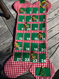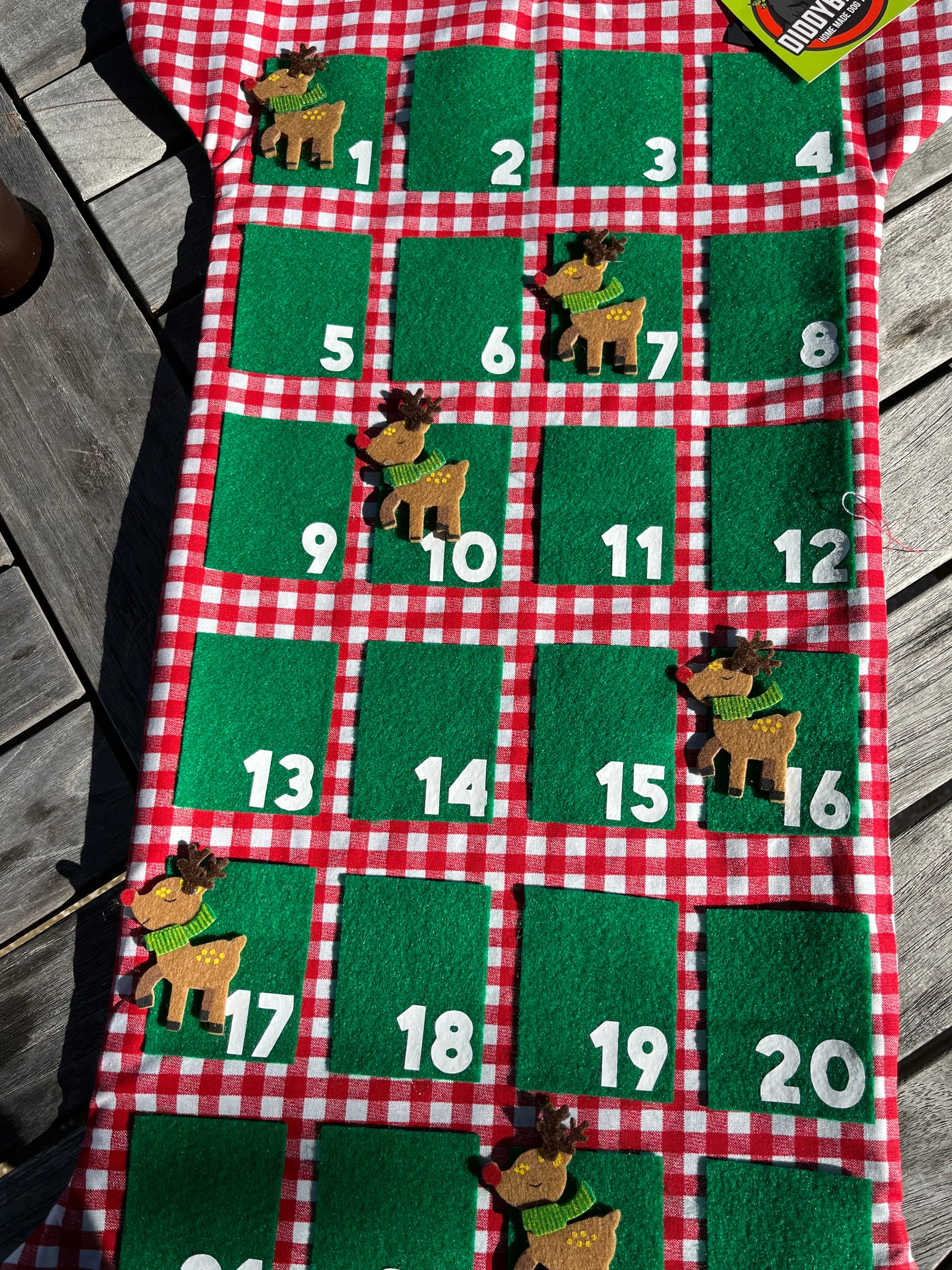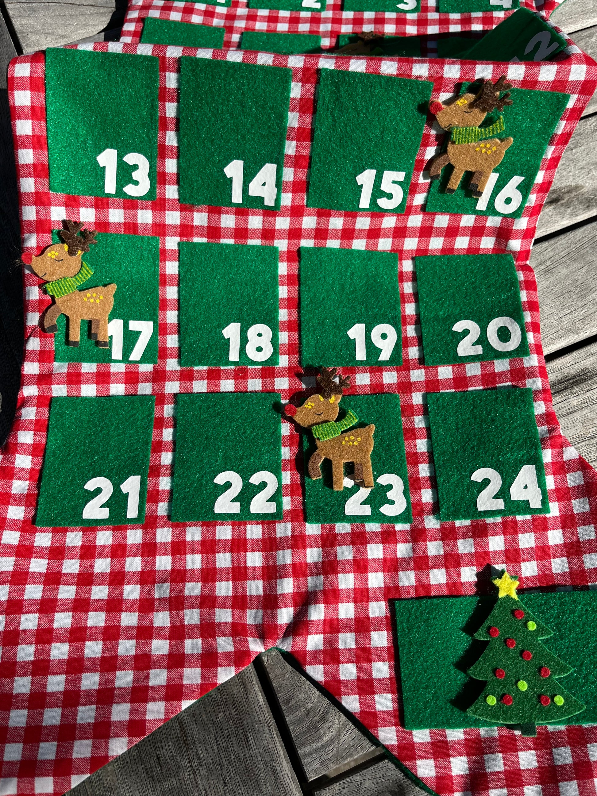 Handmade each calendar measures approx 2ft x 1.5ft. Fun festive cotton fabric with 24 felt pockets to count down the days until Santa. All you do is find the perfect place to hang your calendar (safe from pets) and fill the pockets. Treats not included.