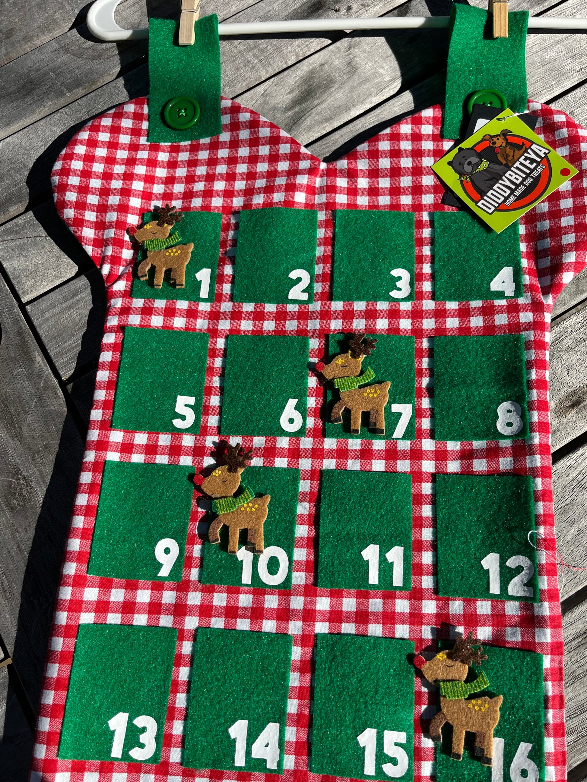 Celebrate the countdown to the holidays with the Prancer Advent Calendar for dogs! Each day reveals a delicious surprise (human provides) that will keep your furry friend excited and tail-wagging. Featuring a charming red Gingham material with green pockets, and a green back, this advent calendar adds a festive flair to your pup’s daily treat routine. Make the season merry and playful, one tasty treat at a time!